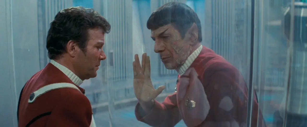 可汗向进取号发动的袭击损坏了曲速核心,造成核辐射泄露,史波克为了拯救全船几百人的生命,进入引擎舱,关闭了曲核,却牺牲了自己。