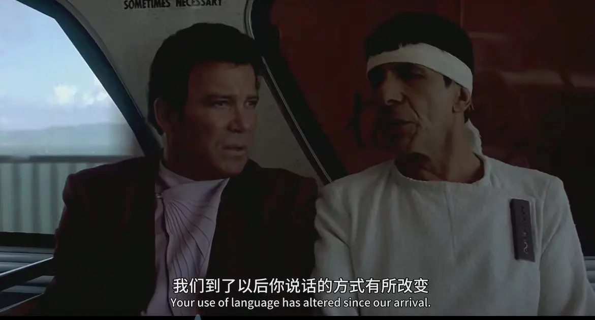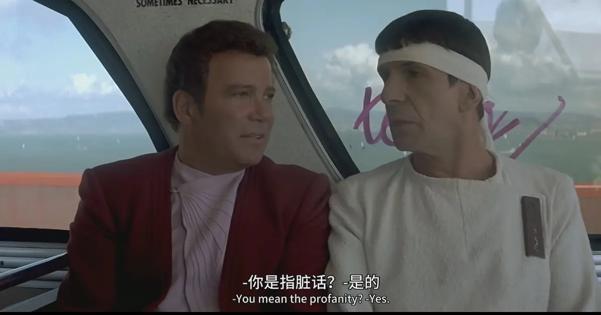 第二是时空穿梭的经典科幻桥段及其所带来的喜剧效果。时空穿梭是科幻作品中永恒的主题,在这部影片中,柯克等人所来自的未来是一个科技高度发达、人类文明一片光明的时代,对二十世纪末期的不熟悉让他们创造了许多笑料。而以他们的眼光反观二十世纪的人类,则又具有强烈的讽刺意味。